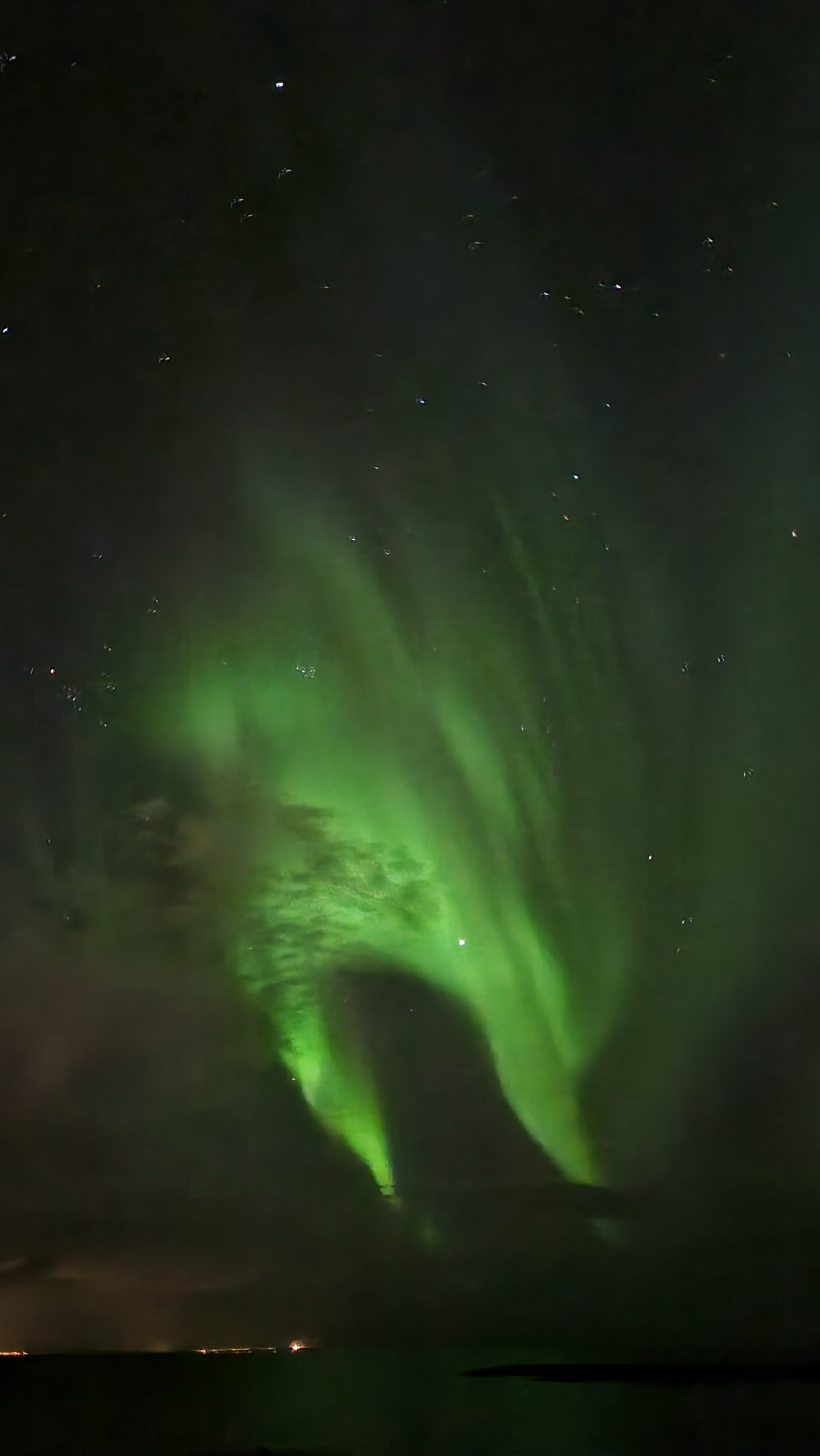 ואז הלכנו (עם לא מעט מקומיים) לשפת המפרץ לצפות בזוהר הצפוני, שמיד הראה סימנים ברורים, רק שהשמיים היו מכוסים בעננים. האפליקציה צפתה פתיחת השמיים ואחרי כחצי שעה אכן העננים החלו להתפזר וזכינו למופע מפעים – כאשר בניגוד ליום הראשון לטיול – הפעם זכינו בבירור גם לראות את צבעי הירוק והאדום, והכל בריקוד נפלא של אורות